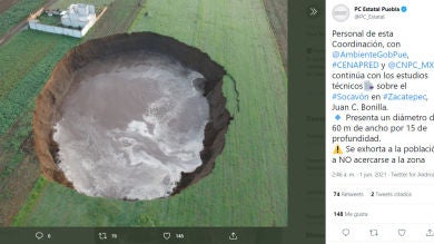 Las increíbles imágenes de un gigantesco agujero que ha aparecido en México se han vuelto virales. Se ha abierto un socavón en una zona de cultivo del estado mexicano de Puebla que que hasta el momento alcanza un diámetro de más de 60 metros y 20 metros de profundidad, según informan medios locales.