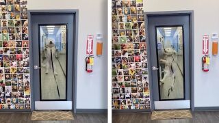 Esta perra salta de emoción cuando su papá la recoge de su guardería para perros. El coordinador de marketing Sam Gibbs, de 22 años, dijo que Twoodle, de un año, estaba muy emocionada de irse a casa cuando vio a su padre en la guardería Dogtopia en Nueva York, EEUU.