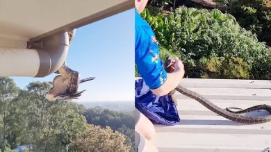 Este es el impactante momento en que un cazador de serpientes en Buderim, Australia, sacó una pitón grande que tenía un pájaro en la boca del canalón de una casa.