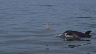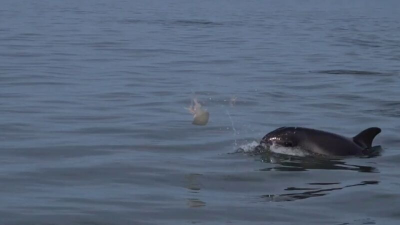 En el video compartido el 24 de enero, un delfín hace rebotar a la medusa dentro y fuera del agua con su nariz, mientras que otro sacude al pez en el aire con su cola.