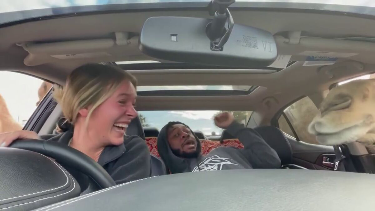 AJ N'Debadahlambo gritó de miedo cuando un camello hambriento asomó la cabeza por la ventanilla abierta de su automóvil durante una visita a un parque de safari en Alexandria, Louisiana.