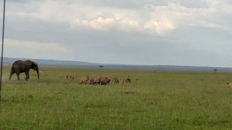 Mientras estaba de duelo, se vio a la manada de leones Topi tratando de comerse al pequeño elefante muerto pero la madre no pudo soportar verlos comerse a su bebé, por lo que se acercó furiosa e intentó alejarlos.