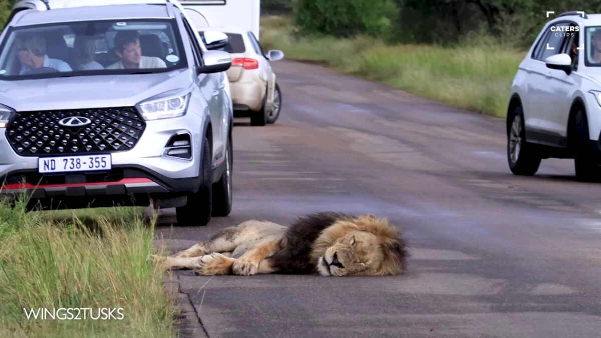 Un león somnoliento provoca un gran retraso en una carretera de Sudáfrica al negarse a levantarse.