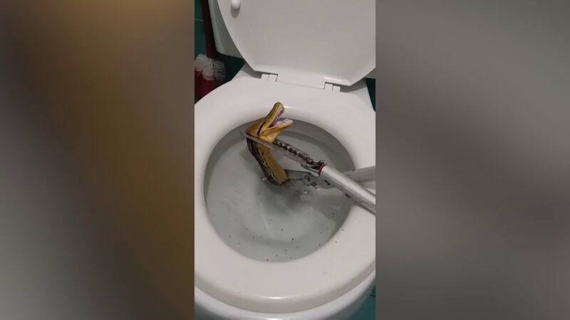 La serpiente finalmente fue retirada de la taza del inodoro. Su estómago era demasiado grande para el agujero, por lo que tuvieron que sacarlo del otro lado con las tuberías desmanteladas.