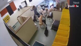 Las imágenes de la cámara de seguridad del Pups Pet Club en Chicago muestran a Samantha Lacy siendo recibida por más de una docena de perros de diferentes razas.