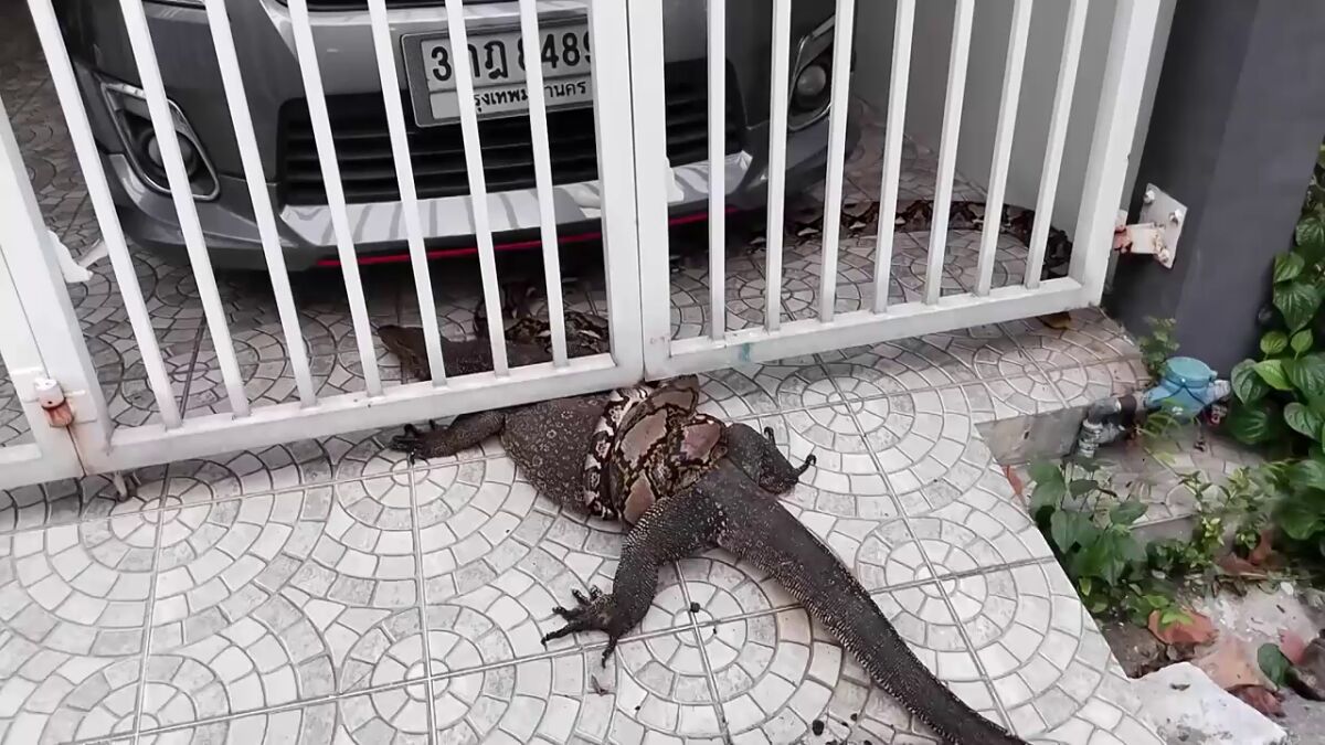 Una pitón salvaje se envuelve alrededor de la barriga de un lagarto monitor y acaban atrapados bajo la verja de entrada de una casa familiar en Bangkok, Tailandia.