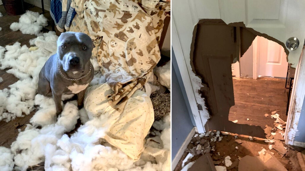 Cuando volvió a casa, Vickie Shelton se encontró con que su perro había destrozado el sofa y la puerta del salón.