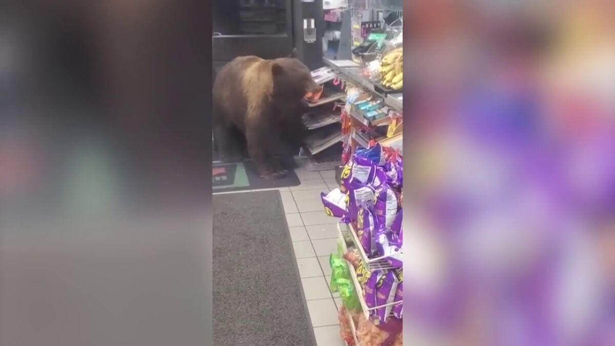 Este es el momento en que un oso pardo hambriento entró en una tienda 7-Eleven en California y comenzó a comerse chocolatinas, dejando al cajero indefenso mirando cómo robaban la tienda.