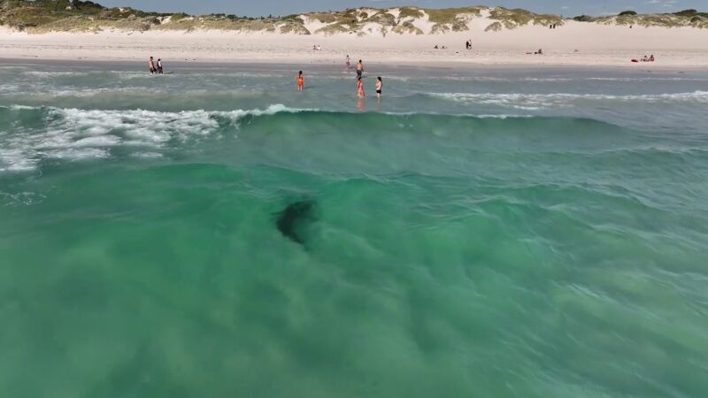 Las aterradoras imágenes fueron grabadas en la playa de Mullaloo, en Australia, por Toby Nicol y muestran al tiburón nadando a escasos metros de los bañistas que no se han dado cuenta de su presencia.