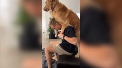 Un golden retriever es llevado a caballito por su dueño todos los días