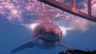 Un gran tiburon blanco choca contra la jaula de dos buceadores