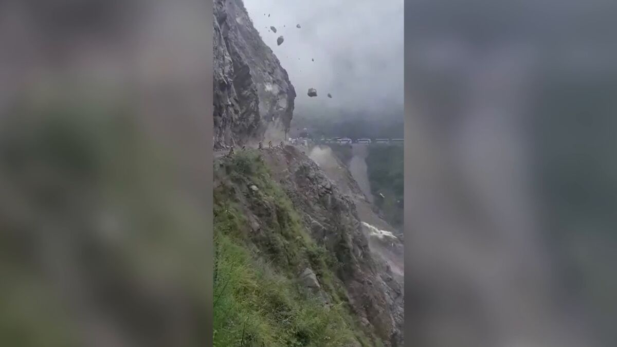 El impactante vídeo en el que se ve enormes rocas cayendo como proyectiles en una carretera de la India