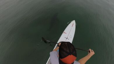 Las impactantes imágenes de un gran tiburón blanco nadando junto a un surfista que no se había dado cuenta