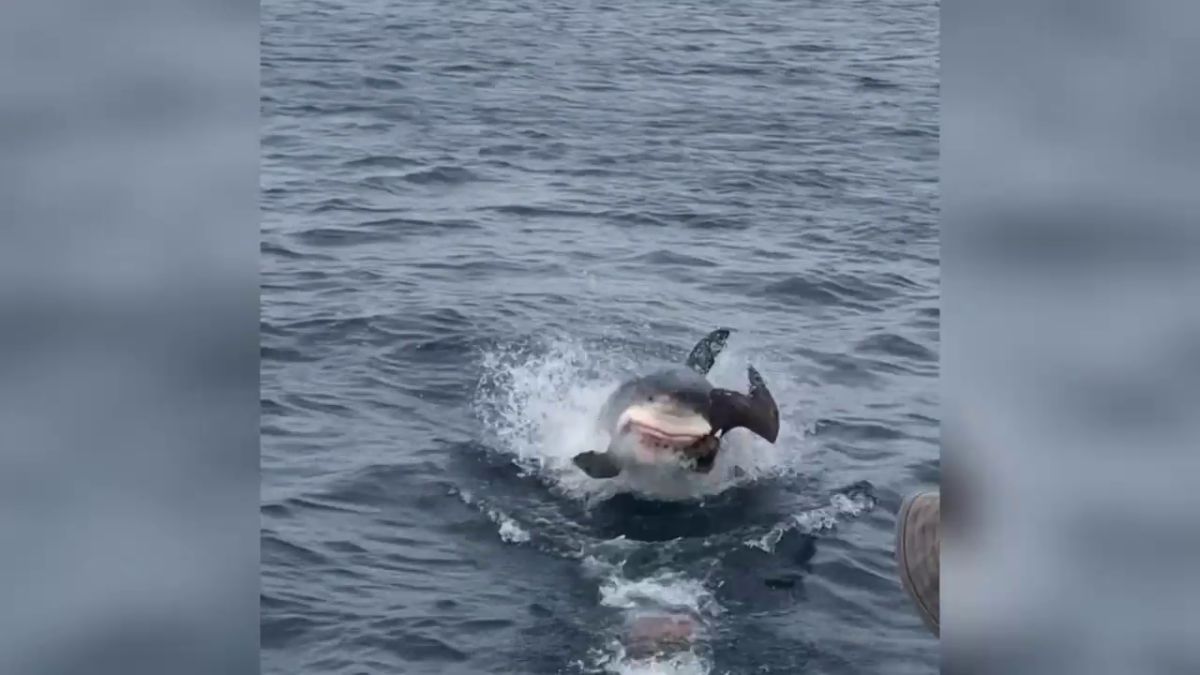 Este es el increíble momento en que un gran tiburón blanco se tragó un ave marina entera, sorprendiendo a un grupo de turistas que lo observaban.