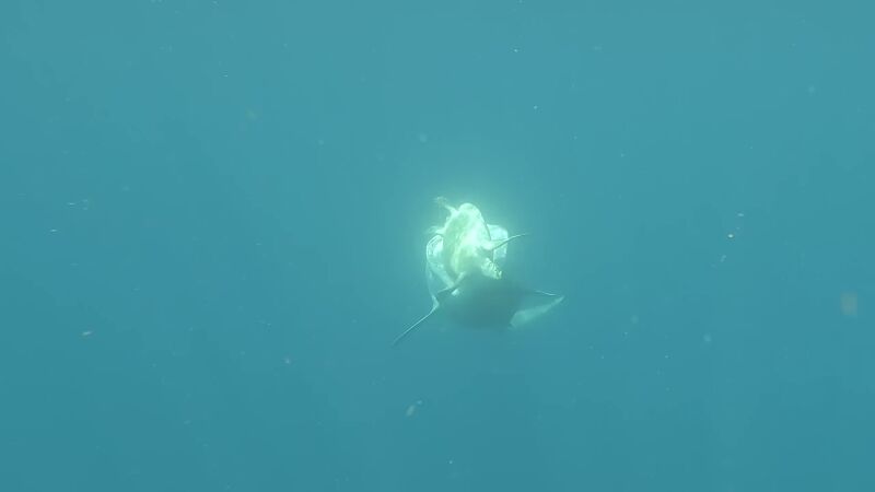 Sin embargo, gracias a las tácticas de la tortuga de mantener su caparazón en la boca del tiburón, no fue tragado y finalmente logró liberarse en la superficie y alejarse nadando.