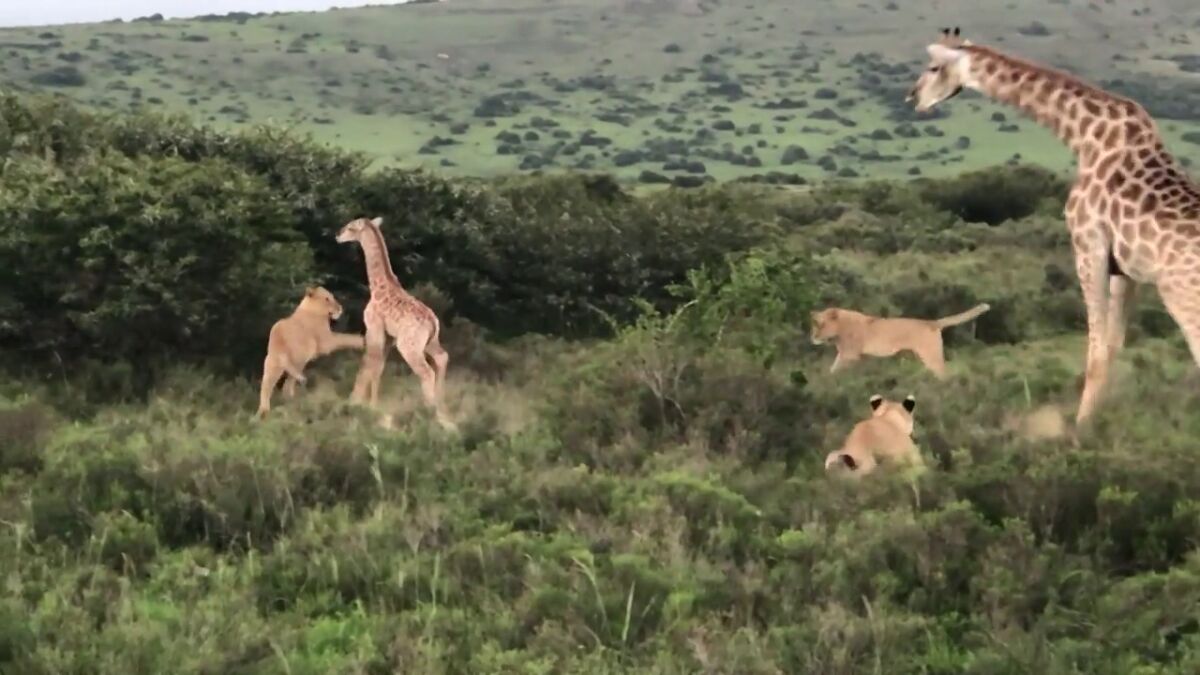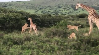 Una jirafa salva milagrosamente a su cría del brutal ataque de unas leonas
