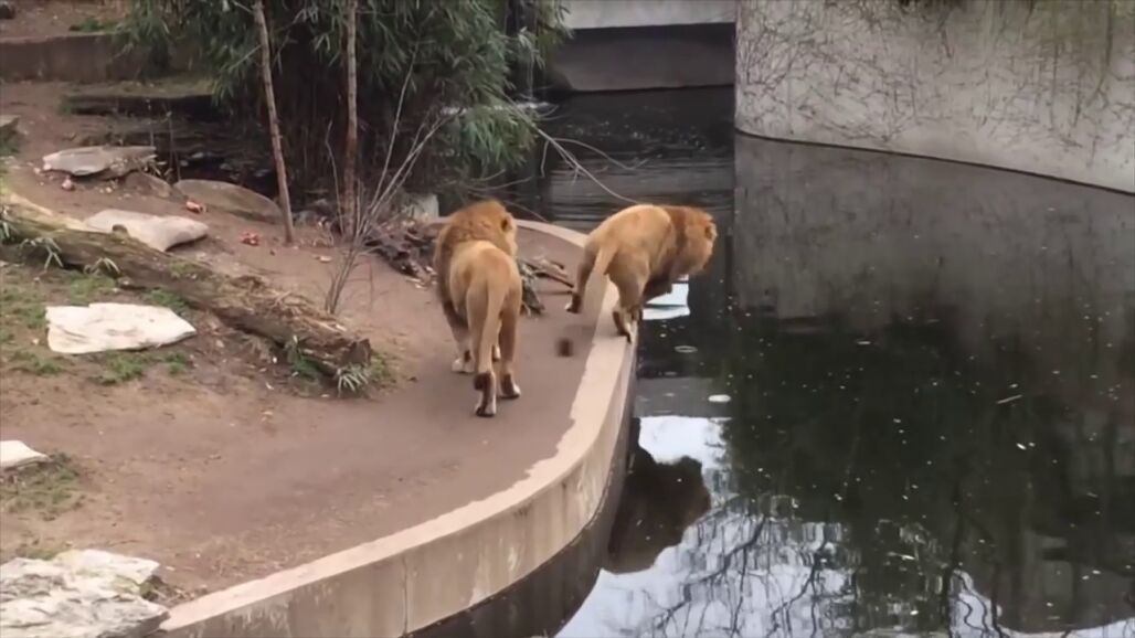 En el video, grabado en febrero de 2018, se puede ver al león caminando por el borde de un foso de su recinto en el zoológico. El león mira a su derecha hacia los visitantes del zoo mientras sigue caminando hacia adelante. Luego llega al borde del foso sin darse cuenta, resbala y termina cayéndose al agua.