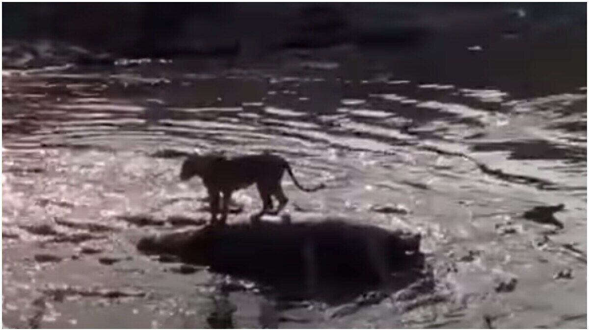Un león varado encima del cadáver de un hipopótamo escapa a través de aguas infestadas de cocodrilos