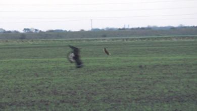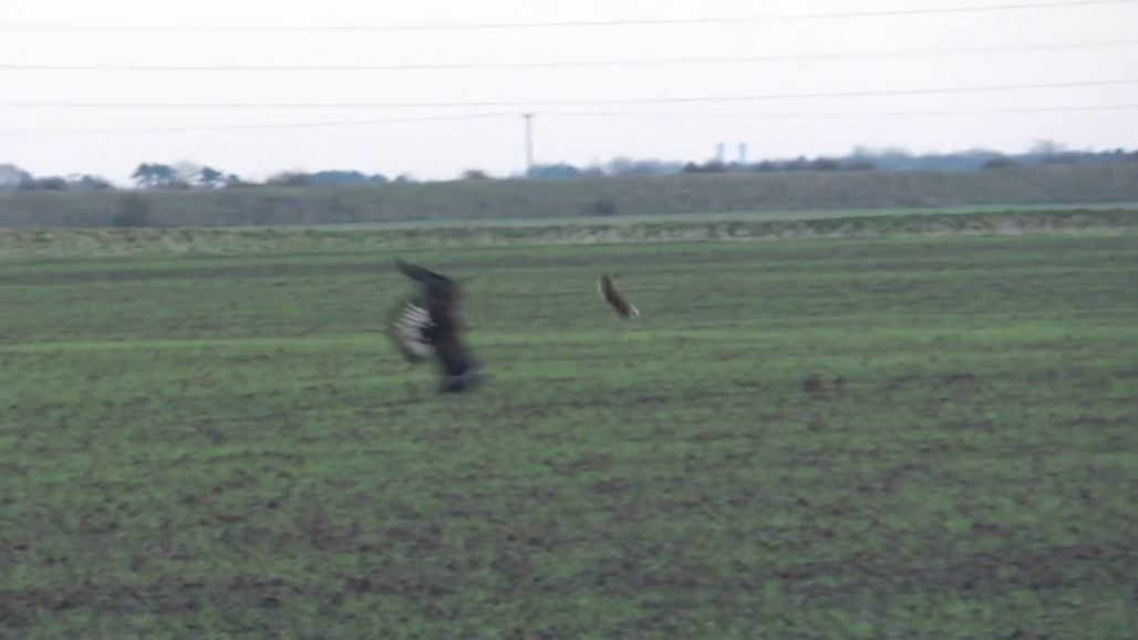 Mientras la liebre huía, se volvió sobre sí misma y saltó sobre el águila de Danny, casi como si estuviera realizando una acrobacia de circo.