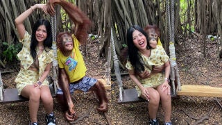 Las imágenes, que se han vuelto virales, muestran al animal llamado Nhong posando con una turista antes de bajar del columpio y pararse detrás de ella para agarrarle los pechos por detrás en el Safari World en Bangkok, Tailandia.