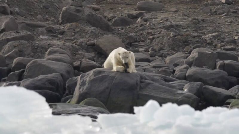 Este oso polar descarado ha sido filmado tratando de encontrar la alegría con una bota vieja desechada, ya que su hogar, una vez helado, se ha derretido y lo ha dejado en las rocas del barón.