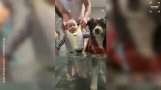 Este adorable video muestra el momento en que un dulce cachorro se junta a su dueño para ayudar a su mejor amigo bebé a aprender a caminar.
