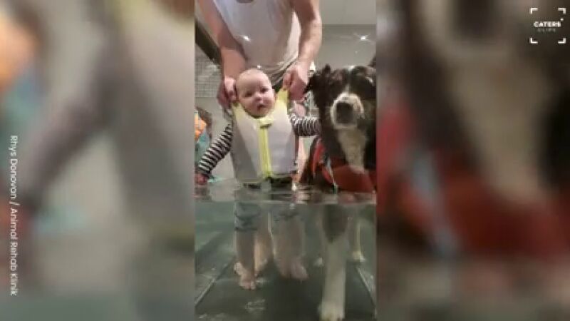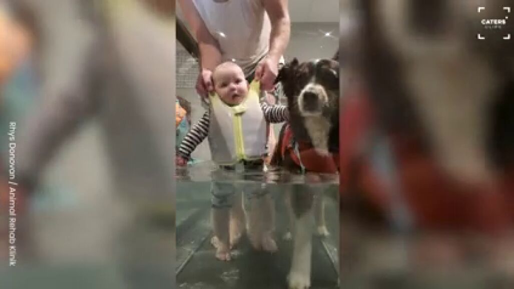 El dúo subió juntos a la cinta de correr acuática para asumir la poderosa tarea de aprender a caminar, pero con su amigo peludo a su lado, este bebé no tuvo ningún problema.