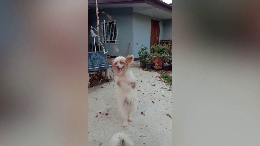 Las imágenes muestran al perro discapacitado de 2 años llamado Jingjo corriendo por el patio usando sus patas traseras en la provincia de Chiang Rai.