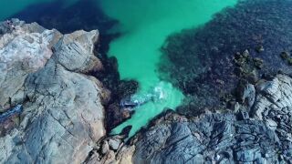 Las imágenes, grabadas el 26 de febrero, muestran a la ballena nadando hacia una cala rocosa y chocando repetidamente contra las rocas.
