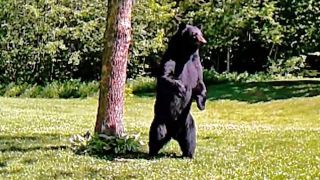 Las imágenes de la cámara de seguridad de una vivienda capturaron a un oso caminando sobre sus patas traseras, fascinado por el comedero de pájaros que había colgado en el árbol.