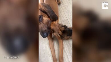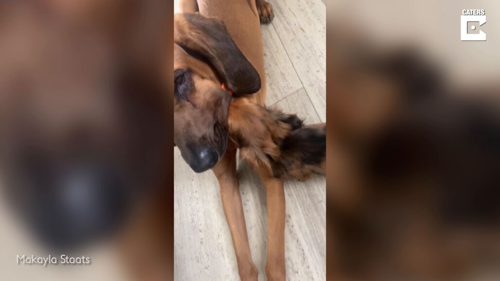 Su dueña filmó a este perro salchicha con su cabeza dentro de la boca de otro sabueso, su hermano Leroy.