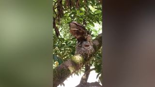 Este es el divertido momento en que unas aves silvestres se escondieron a plena vista camuflándose en el tronco de un árbol de rambután en Indonesia.