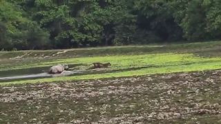 La robusta criatura salvaje parece notar algo que acecha cerca y se mueve con un propósito hacia él. De repente, un tigre salta del agua y el rinoceronte lo persigue hasta la orilla del abrevadero ahuyentándolo fuera.