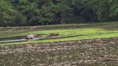 Un visitante de un parque nacional en el noreste de la India grabó el raro momento en que un rinoceronte salvaje persiguió a un tigre.