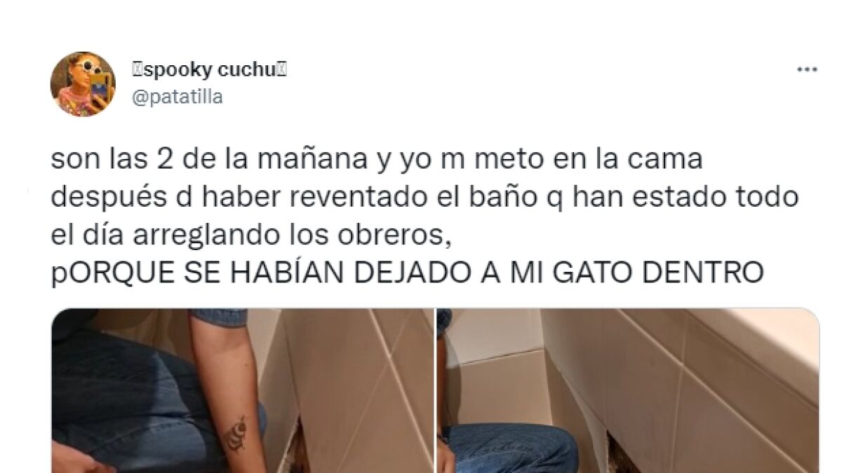 "Son las 2 de la mañana y yo m meto en la cama después d haber reventado el baño q han estado todo el día arreglando los obreros, pORQUE SE HABÍAN DEJADO A MI GATO DENTRO", escribió en un este tuit viral que ya ha acumulado más de 400.000 'me gusta', 30.000 retuits y 2.000 comentarios.