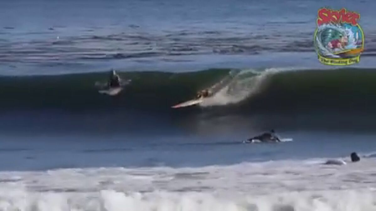En ellas se ve como Skyler surfea de forma perfecta y sin caerse una gran ola en la playa de Santa Cruz mientras su dueño la anima mientras graba las imágenes.