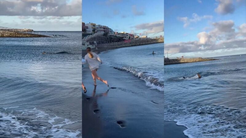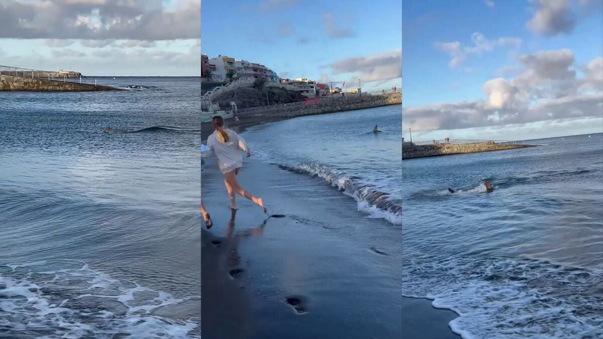 Un tiburón acecha en la orilla y aterroriza a unos bañistas que salen corriendo en una playa de Gran Canaria