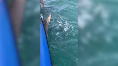 "Rápidamente abandonamos el área y nos alejamos de la bola de cebo que estaba debajo de nuestro bote. Luego tuvimos que regresar a la orilla muy lentamente, para que el bote no se hundiera", aseguró sobre el accidente.