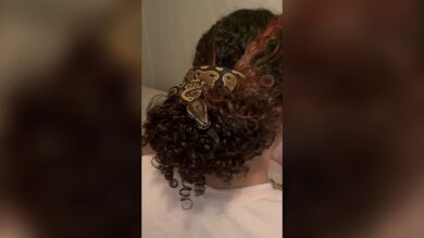 Esta mujer no necesita preocuparse si se le acaban los accesorios para el cabello porque puede usar su serpiente pitón como sustitución perfecta de coletero.