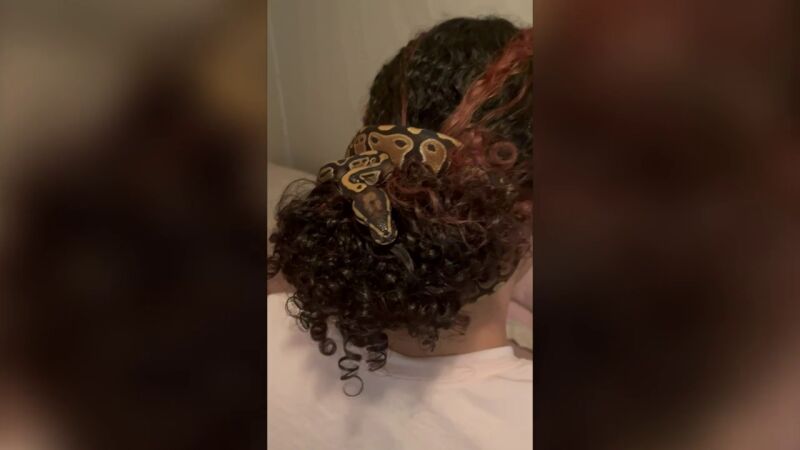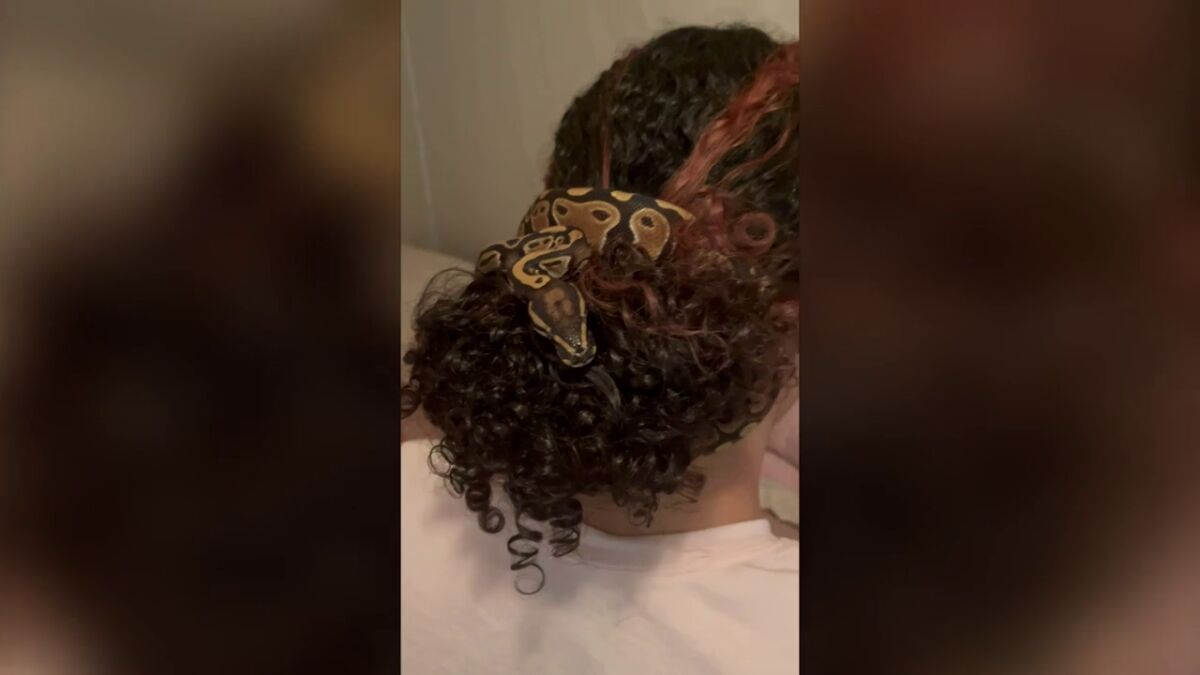 Cheyanne descubrió que a su pitón bola rescatada le había gustado su cabello cuando socializaba con él, e hizo que su novio, Donovan Uhnavy, registrara el comportamiento inusual de la serpiente.