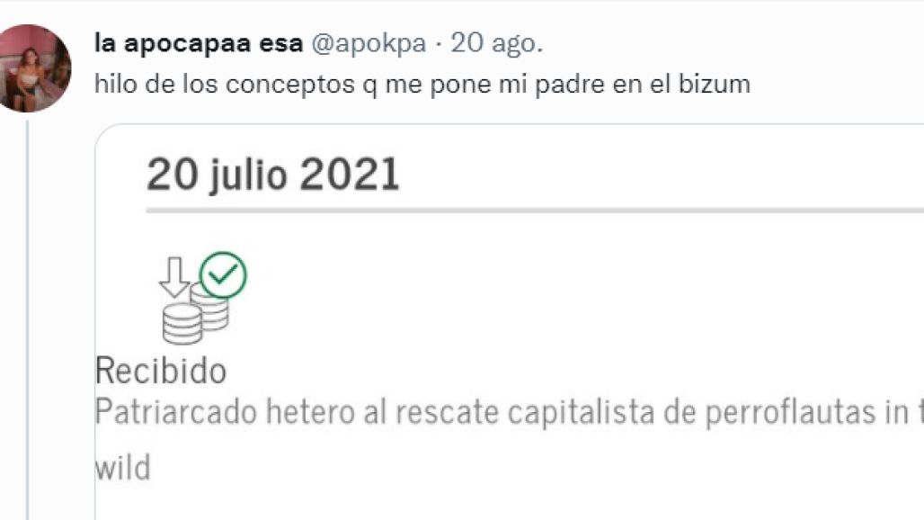 Y hablando de conceptos, ahora, una usuaria de Twitter se ha hecho viral precisamente por los conceptos que su padre le pone en esta plataforma. @apokpa, el nombre de la protagonista de este hilo, ha revelado que le pone su padre cuando le hace un Bizum, como "Patriarcado hetero al rescate capitalista de perroflautas in the wild" o "Subvención porxufontística a la independizada de pa sucat amb oli".