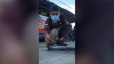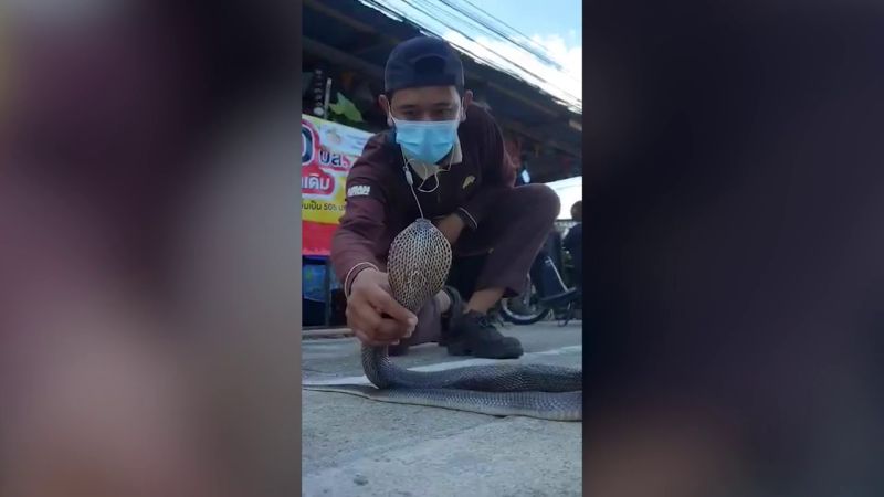 El hombre del video, Jakrayuth Wapha, de 29 años, fue llamado para atrapar la cobra de un metro de largo que se encontró deslizándose dentro de la tienda de comestibles de una anciana.