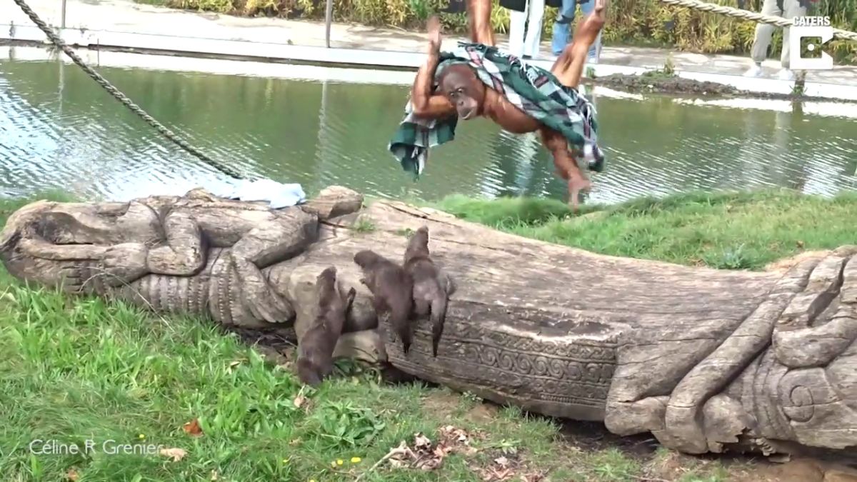 Se puede ver al trío persiguiendo al joven organgután, que se dedica a tentar y molestar a las nutrias con la manta mientras juegan juntos.