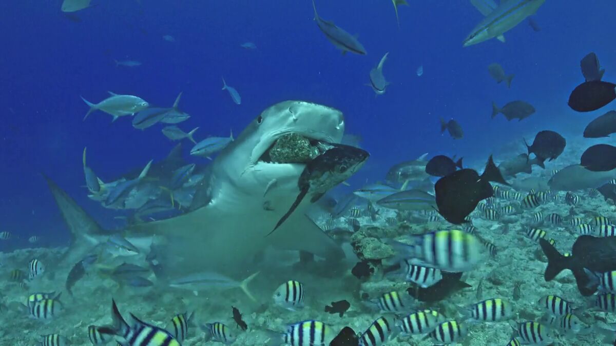 Un tiburón tigre logró morder un trozo de roca mientras se dabe un festín de peces en las Maldivas.