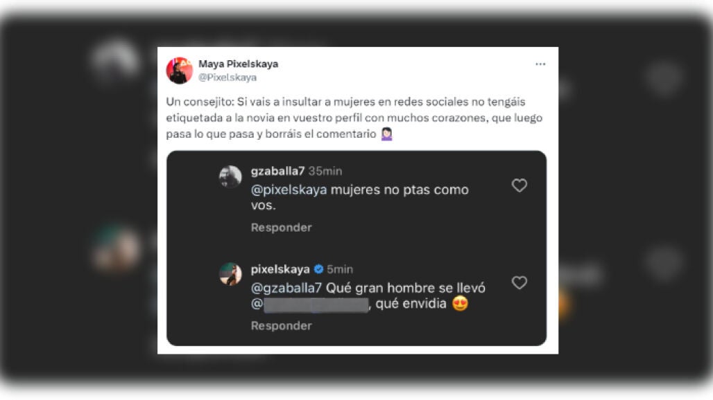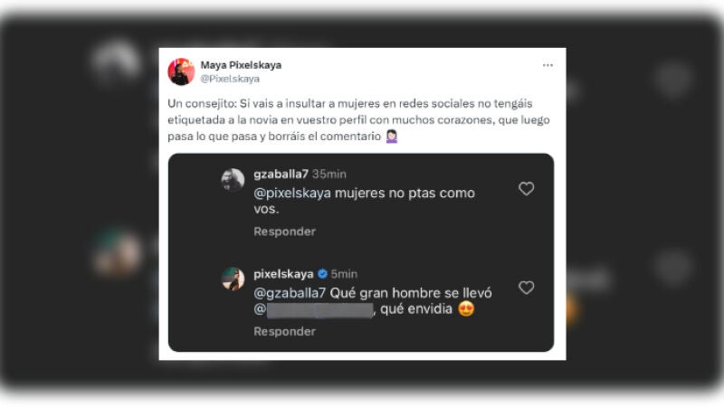 Cuando este chico decidió poner un comentario insultante, Maya no tuvo más que echar un vistazo a su perfil para encontrar la mejor manera de responderle: mencionó a su novia, y la felicitó por tener a su lado a un hombre tan bueno, que se dedica a insultar a otras mujeres en redes. Como el hater borró su comentario, Maya decidió compartir una captura en Twitter para seguir mofándose de él. El tuit ha conseguido acumular varios cientos de miles de impresiones, y ha generado una buena oleada de comentarios al respecto de la actitud condenable del chico.