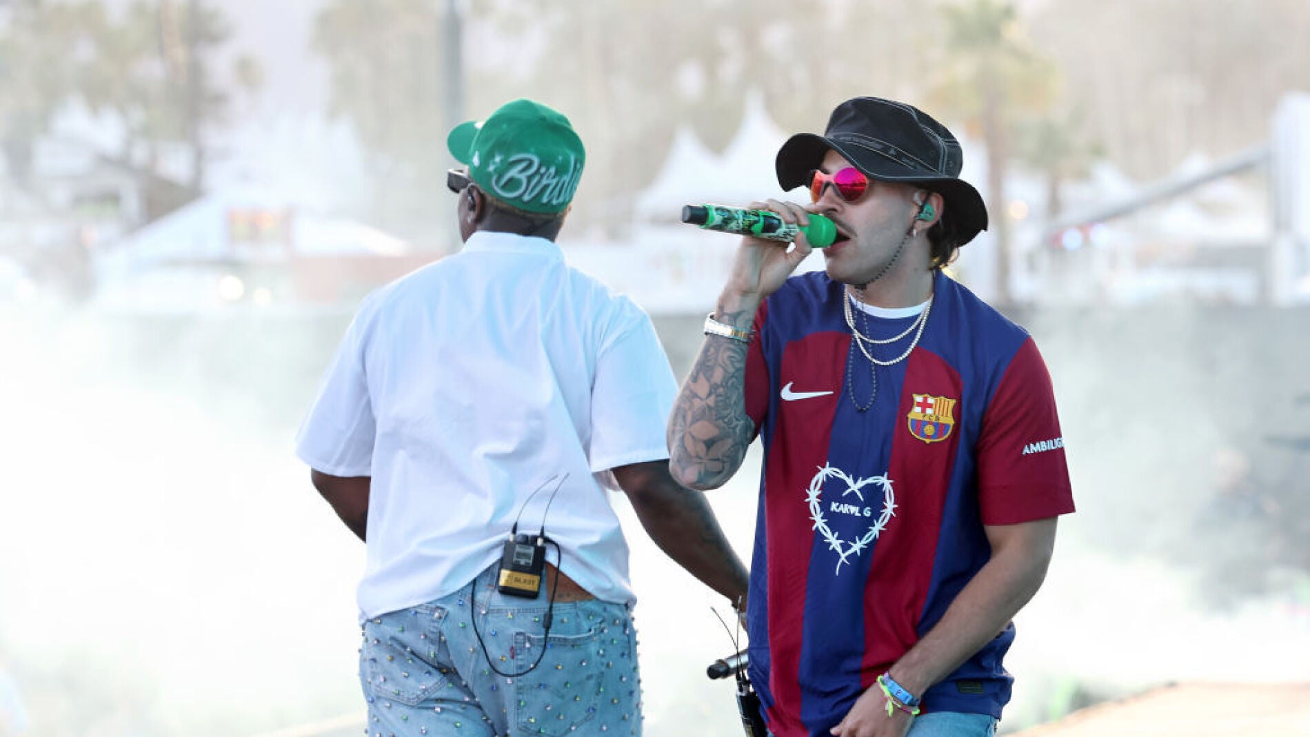 El rapero colombianbo Feid quiso tener un gesto con su novia Karol G cuando fue invitado por Blxst en Coachella. Ferxxo actuó con la edición especial de la camiseta del FC Barcelona con publicidad de Spotify y Karol G.