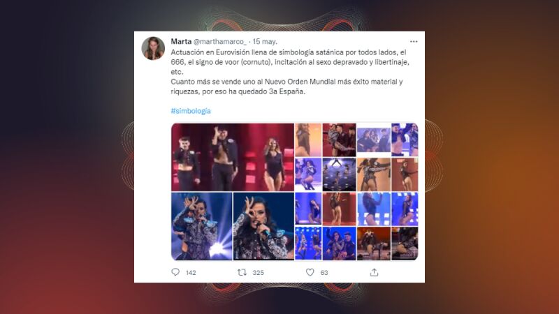 Otros afirman que la actuación escondía simbolos masones como @NoSPDisidentes que asegura que "Un culo y una bandera de Españita para atraerlos a todos y atarlos en las tinieblas de Eurovisión donde se extiende la masonería".
