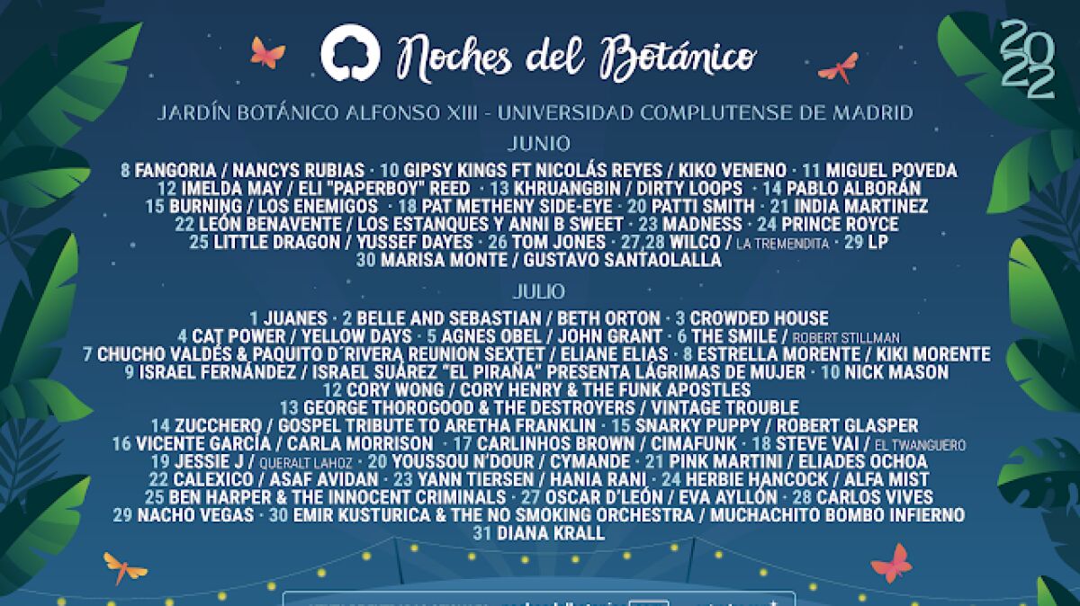 Noches del Botánico 2022 retomará gran parte de la oferta internacional prevista para la fallida edición de 2020 a causa de la pandemia y contará con estrellas previamente confirmadas como Wilco o Crowded House, a las que se sumarán otras inesperadas como Patti Smith, Diana Krall, Juanes y Carlos Vives.