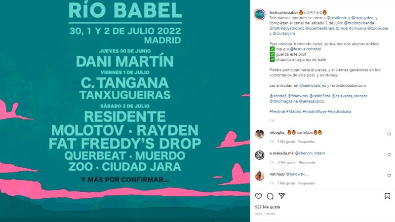 En días previos, el público podrá disfrutar de dos de los madrileños más célebres: Dani Martín, que actuará el jueves, y de C.Tangana que, junto al fenómeno musical del año, Tanxugueiras, completan la propuesta del viernes a la espera de más nombres para la ambiciosa nueva edición de Río Babel.