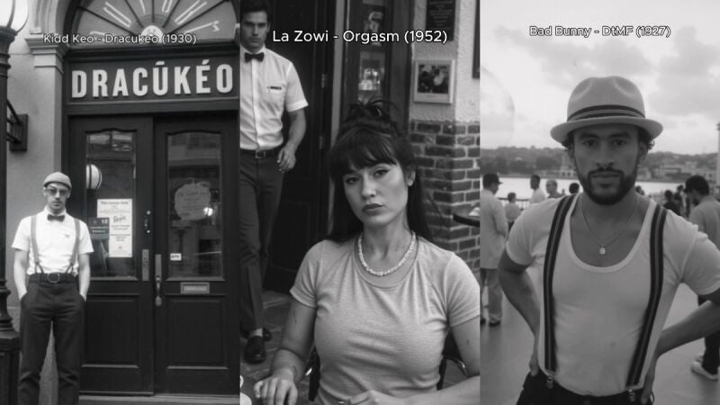 Pero Álex no se detiene ahí. También emplea herramientas de inteligencia artificial para crear imágenes que acompañan sus videos. Estas ilustraciones muestran a artistas contemporáneos, como Rosalía o Bad Bunny, vestidos con la moda de las épocas que Ferrer recrea. Es un guiño visual que complementa la atmósfera retro de sus creaciones.